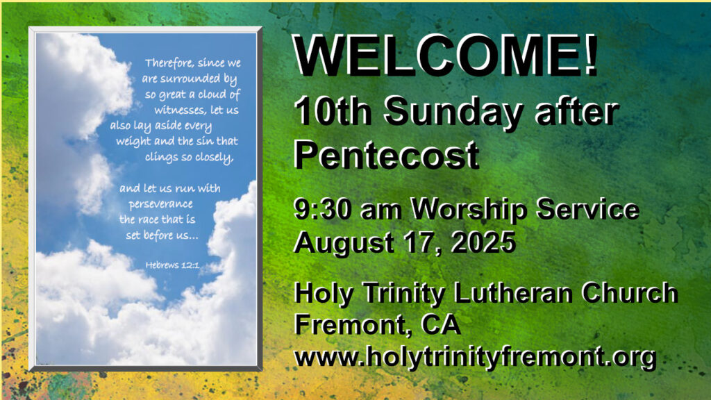 HTLC News – August 15, 2025 Pentecost 10 Hello, Everyone! This Sunday, August 17th, we will be celebrating the 10th Sunday of Pentecost, where one reading says that Jesus is the perfector of our faith and another one says that families will be divided because of that very faith! Good luck, Pastor Tim! It is also Fill the